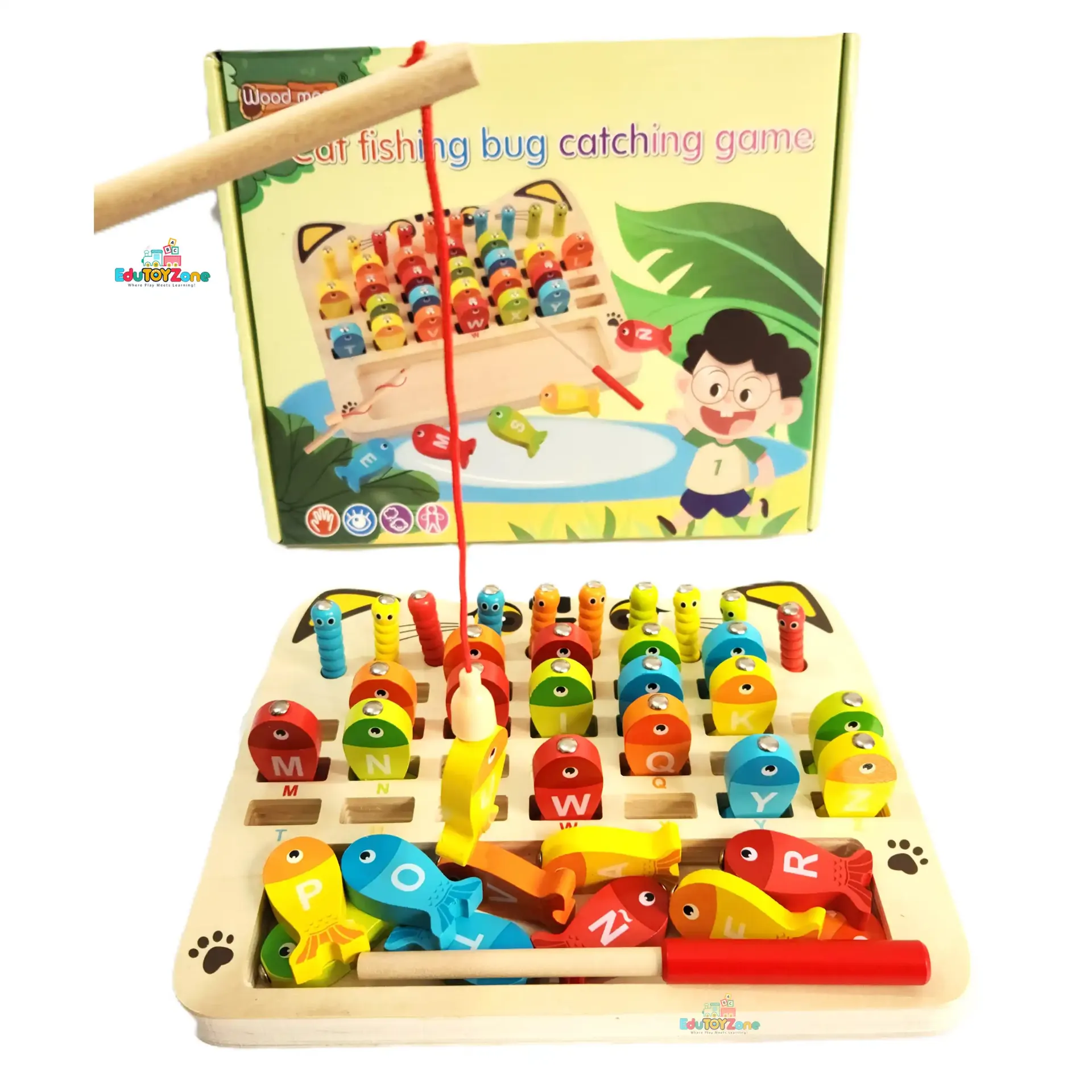 Fun-filled wooden game where kids can enjoy fishing and bug-catching while learning letters!