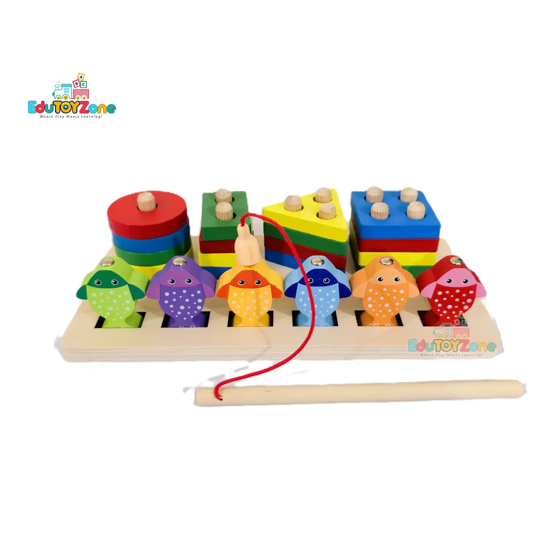 Fun 3âinâ1 wooden toy for fishing, lacing, and matching to spark early learning!
